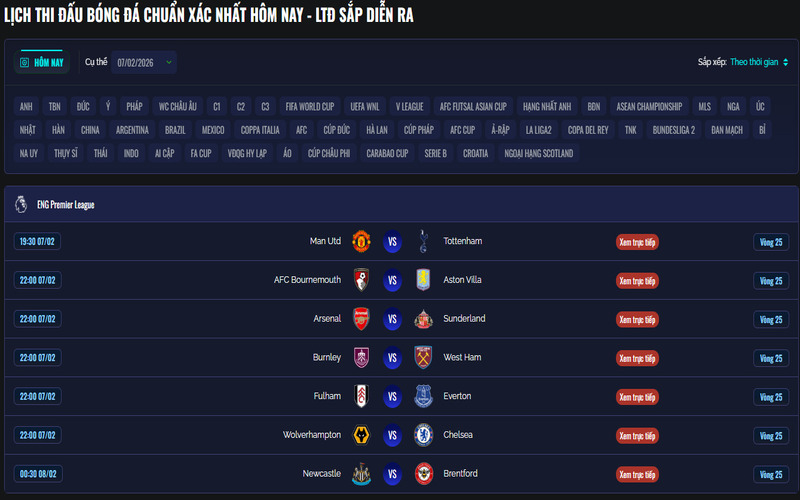 - Bước 2: Tại trang chủ, tìm trận đang phát trực tiếp hoặc sắp diễn ra theo giải đấu bạn quan tâm.