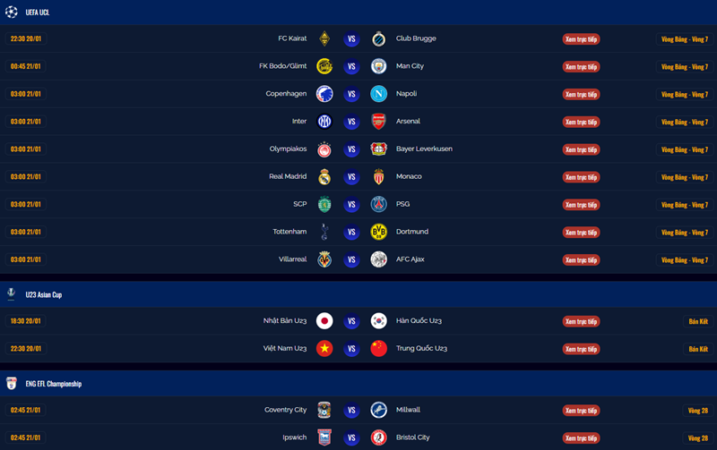 - Lọc theo giờ, ngày hoặc trạng thái trận đấu, giúp người dùng không phải lướt qua cả danh sách dài các trận ít quan tâm.